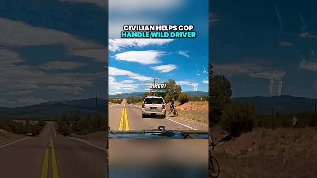 This video opens on a peaceful stretch of rural highway. Clear skies. Open road. Nothing unusual — until a silver SUV begins swerving wildly across lanes. Immediately, the situation shifts from calm to chaotic. The pursuing officer watches as the vehicle drifts toward the shoulder, heading straight toward a cyclist riding along the edge of the roadway.