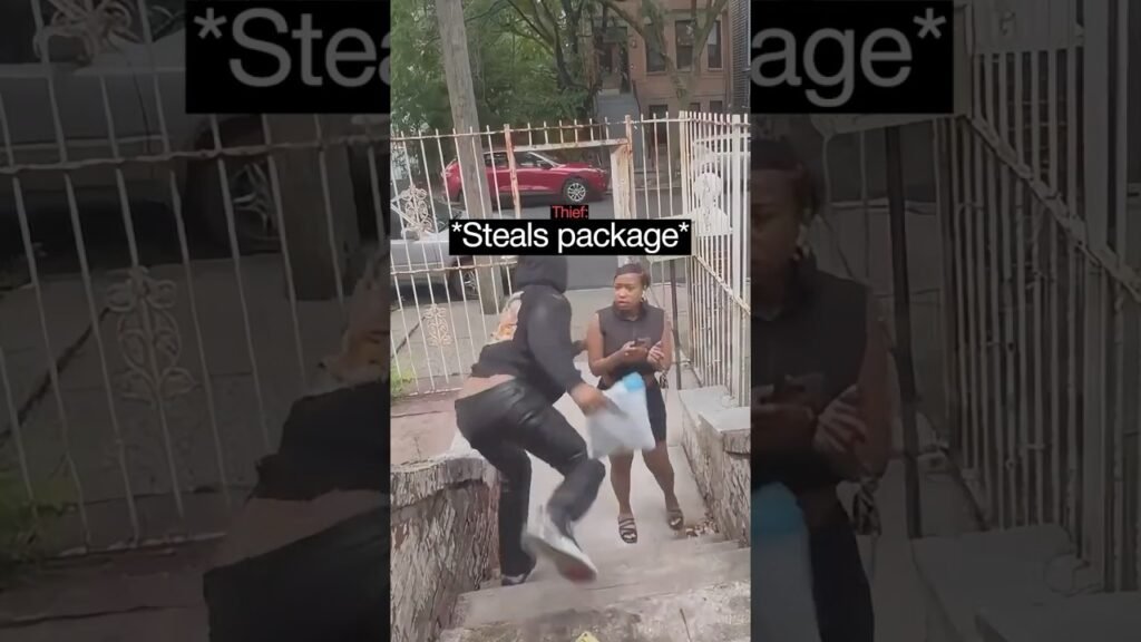 The video begins with a delivery woman walking up the steps of a home. Holding a white envelope-style package, she sets it carefully near the door, completing what appears to be a standard drop-off. She turns to leave, walking back down the stairway. Everything seems routine—until the children living at the home call out to her.