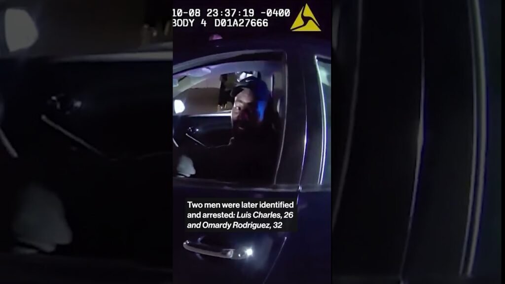 Captions identify the suspects as Luis Charles, 26, and Omardly Rodriguez, 32. Both men were reportedly involved in a coordinated effort to track, ambush, and abduct the intended victim. The officer’s calm yet firm commands reflect the seriousness of the situation as additional units arrive.