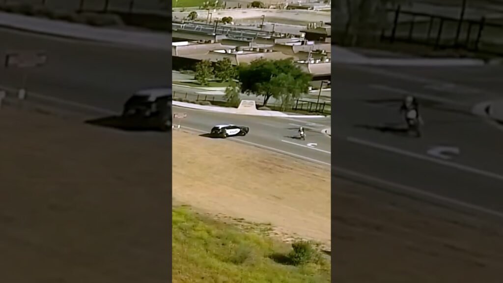 As the footage continues, the gap between the motorcycle and the police SUV expands. The officer follows the same path, but the size and weight of the cruiser limit how quickly it can respond to the suspect’s bursts of acceleration. From the aerial perspective, it becomes clear that the motorcycle’s superior agility gives the rider a significant advantage during the pursuit.