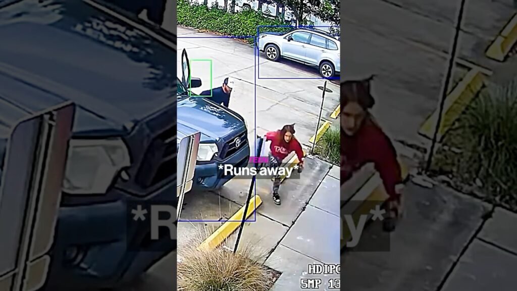 The incident begins in a parking lot, where security footage captures a pickup truck rolling slowly with a panicked teen visible through the passenger-side window. The teen screams “HELP!” while gesturing urgently, signaling an immediate emergency. This alarming scene set the stage for a rapid and coordinated police response.